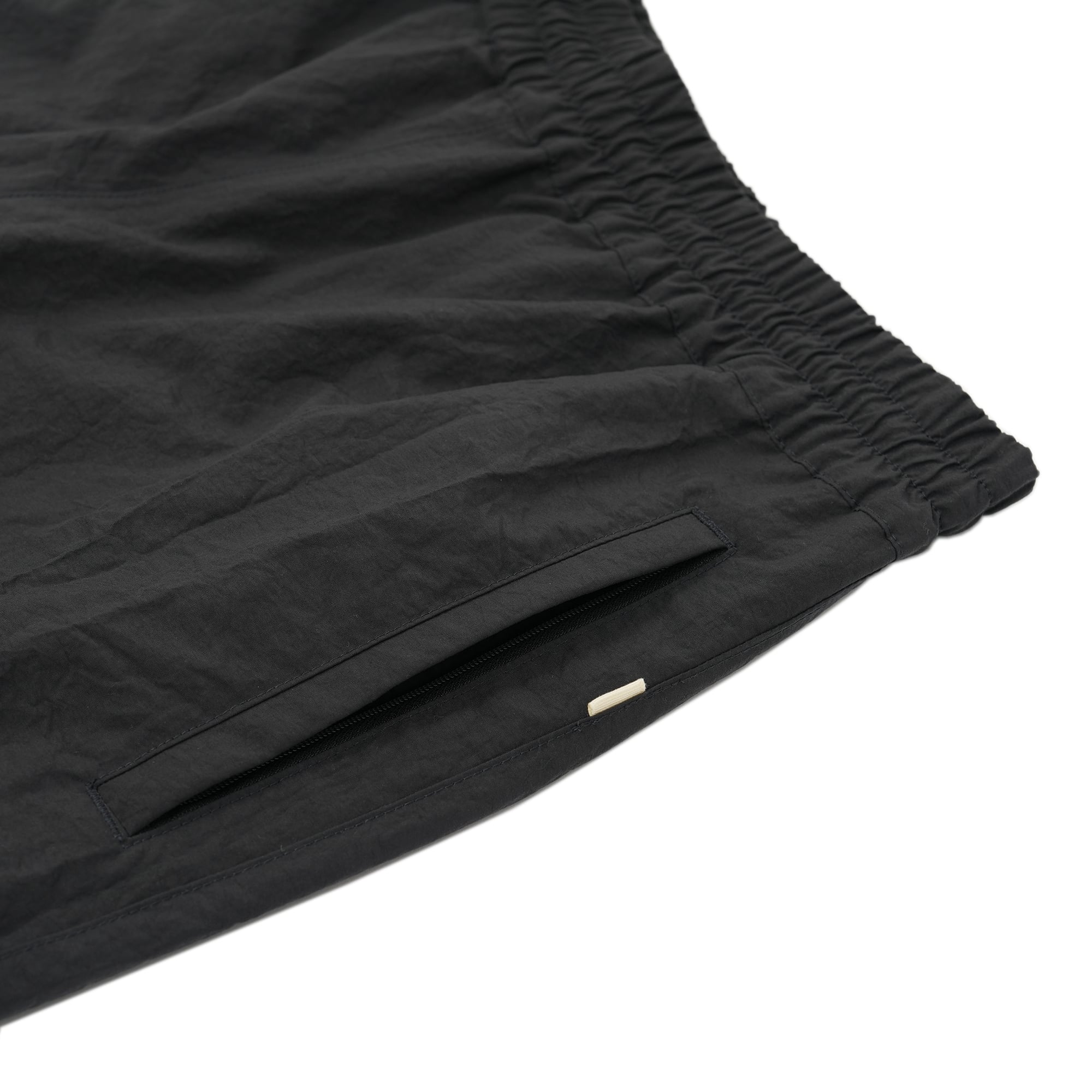 リサイクルナイロンに撥水加工を施し、OVYの別注色で染め上げた"SUMIKURO"の生地。90'sスポーツウエアがデザインソースとなったイージーパンツ。ウエストはシャーリングでストレスフリーで、裾口はコードで絞ることもでき、またジップによって様々なシルエットを楽しめる万能パンツ。